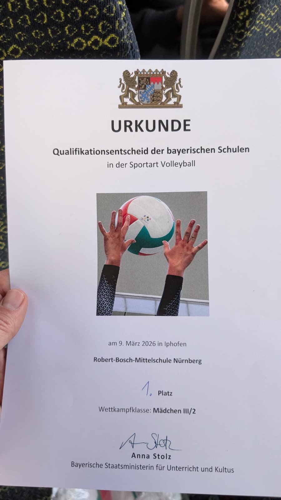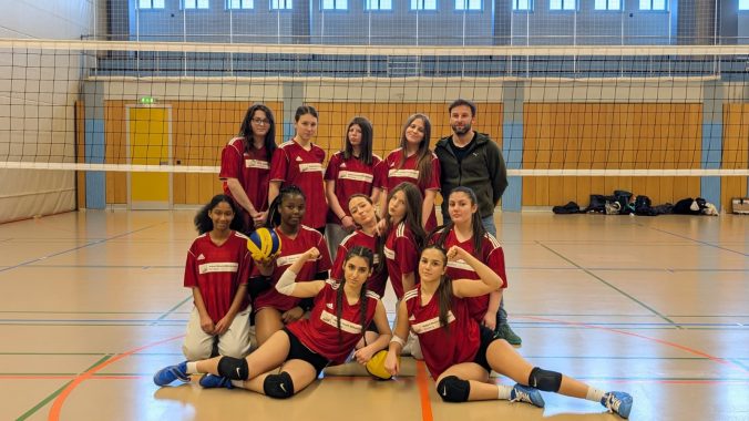 Nachdem wir von der Schule mit der U-Bahn nach Ziegelstein gefahren sind, holte uns ein Bus ab. Die Fahrt nach Iphofen dauerte ca. eine Stunde. Wir waren sehr aufgeregt und haben uns auf das Spiel gefreut. Die Nordbayerische Meisterschaft fand in einer sehr schönen und modernen Halle statt. Wir wärmten uns mit den anderen auf und das Spiel begann. Den ersten Satz konnten wir deutlich mit 25:13 gewinnen. Im zweiten Satz wurde es dann richtig spannend: Wir lagen bereits mit 17:22 im Rückstand! Doch dank starker Aufschlagserien von Asmin und Duru haben wir das Spiel noch gedreht. Den entscheidenden Siegpunkt machte schließlich Marcia. Voller Freude und Stolz stiegen wir in unseren Bus ein und traten die Heimfahrt an.